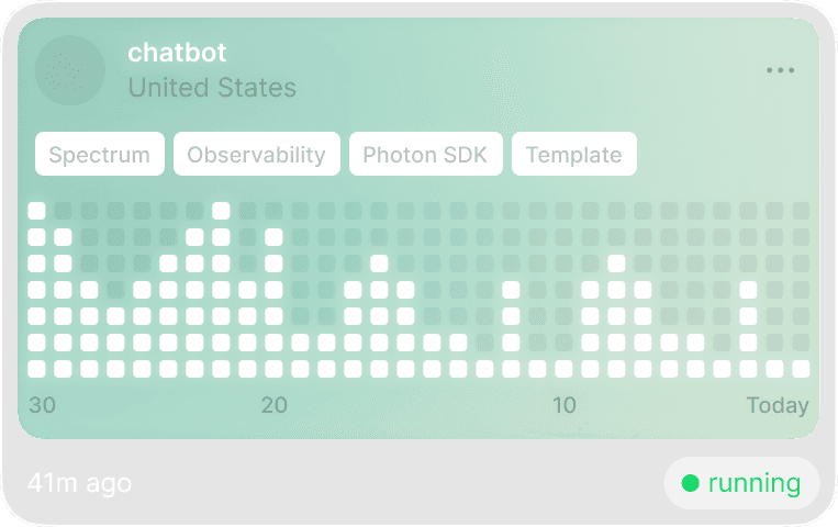 Low latency, high reliability. Spectrum is built to power real-world agents at scale - delivering fast, reliable messages in under 1 second on Photon's edge network with 99.9% uptime.